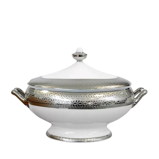 Bring a luxurious element to formal dining with shimmering platinum-embellished porcelain serving pieces by Bernardaud.