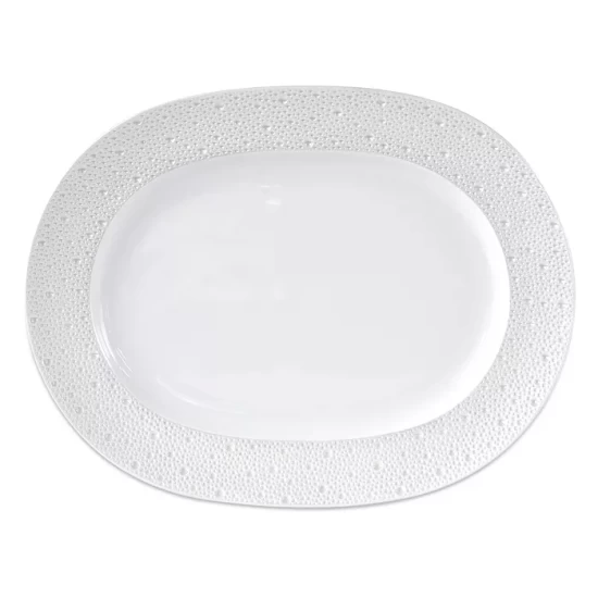 - The Ecume Perle oval platter features a subtle mother-of-pearl finish for a soft, shimmery look.