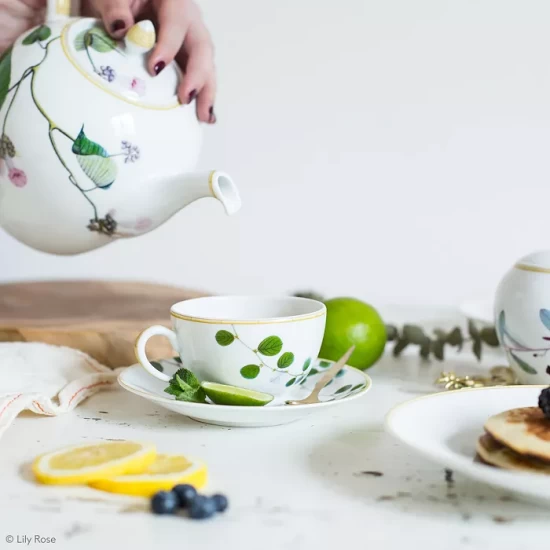 - Capacity: Tea Cup, 4.5 oz.; Tea Pot, 34 oz.; Creamer, 10 oz.; Sugar Bowl, 12 oz.;
