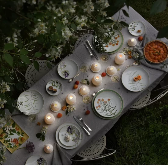 Adapted from botanical drawings of gardens in Mumbai, India, where an abundance of rare plant species grow, precisely detailed floral and vegetal illustrations adorn this fine porcelain plate from Bernardaud. It’s edged with a rattan trompe l’oeil pattern reminiscent of popular Indian furniture designs.