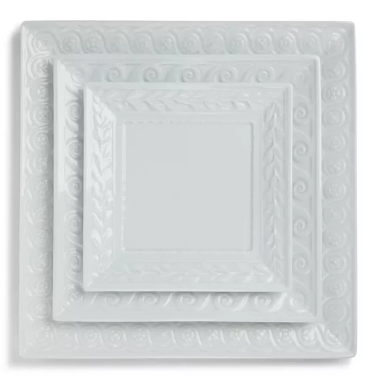Bernardaud created this chic, modern square take on their popular Louvre dinnerware. Each piece draws its inspiration from architectural motifs that adorn the exterior of the Louvre museum.