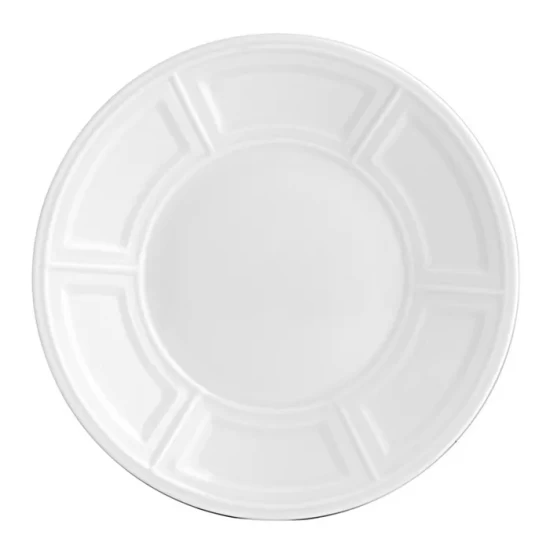 Architectural, white Limoges china with subtle relief patterns. Inspired by the coffered ceilings of Renaissance castles, its geometric motif emphasizes the sense of depth and quality of the material.
