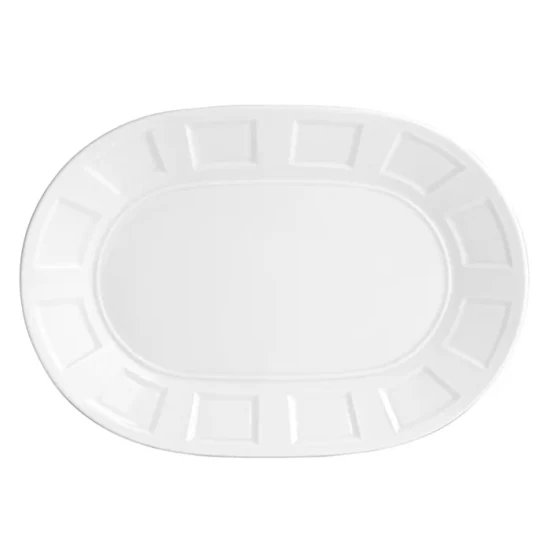 Architectural, white Limoges china with subtle relief patterns. Inspired by the coffered ceilings of Renaissance castles, its geometric motif emphasizes the sense of depth and quality of the material. Accessories shown: Beverage server, creamer, sugar, soup bowl.