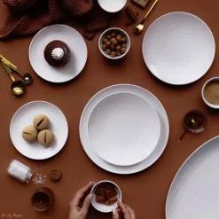 An ideal service for contemporary interiors, the simplicity of the finish resembles the weave of a natural fabric. The basis for “Everyday Elegance,” this versatile porcelain service offers the ability to go from day to evening with the substitution of a mug to tea cup/saucer and coupe soup to rim soup.