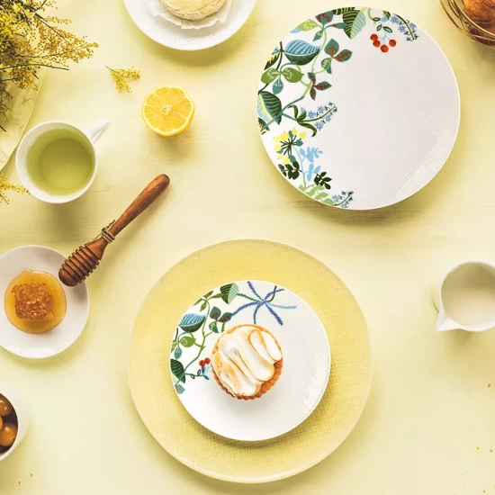 Exclusively ours, Bernardaud’s classic Organza Jardin collection is updated with a vibrant floral motif that brightens the edges of plates, bowls and more.