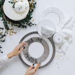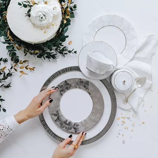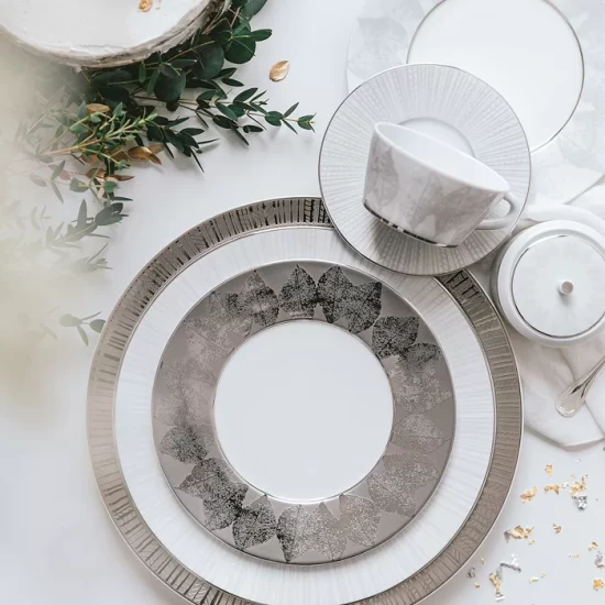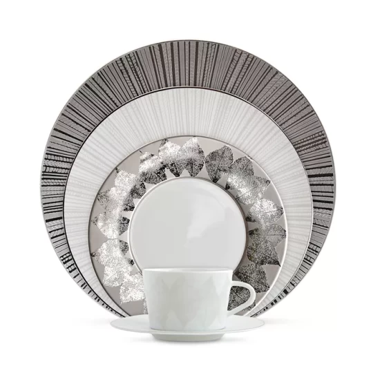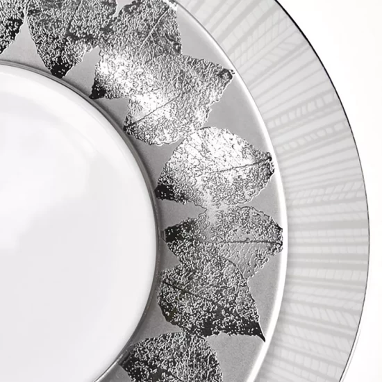 Modern yet timeless, Bernardaud Silva Dinnerware invites one to admire the beauty of nature with white-on-white or platinum relief patterns inspired by leaf veins and lace-like plant fibers. The collection’s name comes from the Latinum “silva,” a poetical evocation of trees.