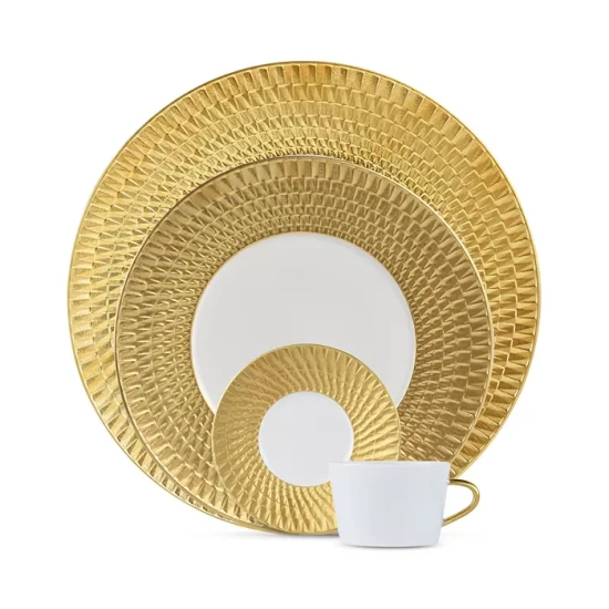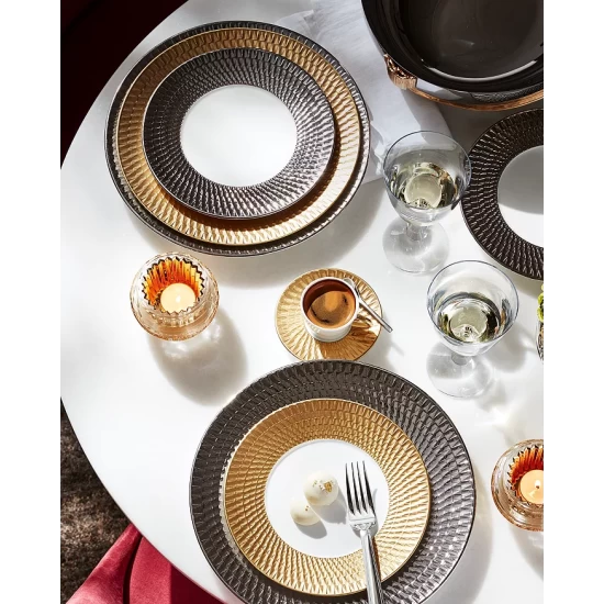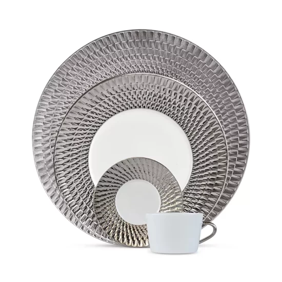 Alternating matte and shining surfaces bring a vibrant radiance to the Twist Dinnerware collection by Bernardaud. The delicate design combines various influences – from the effects of light on Japanese rice paper to the 3-D graphics of new technologies – to create the look of a geometric pattern in twisted motion.