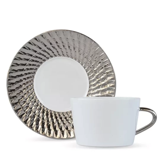- Engraved on the rim of the plates and on the outside of the various pieces of the collection, it is the light that reveals the alternation of matt and shining rendering