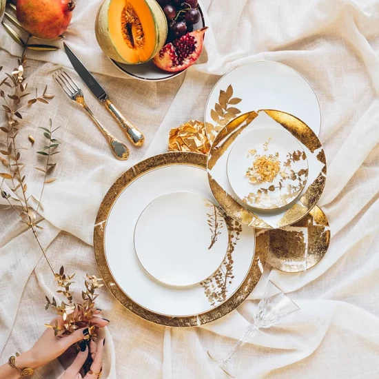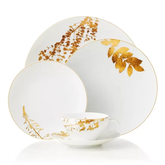 A coupe shape service decorated with golden leaves that seems to be brought to life by a subtle variation of nature in each piece. Vegetal Gold can stand alone or be accented with Diamond, Gold or Palmyre.