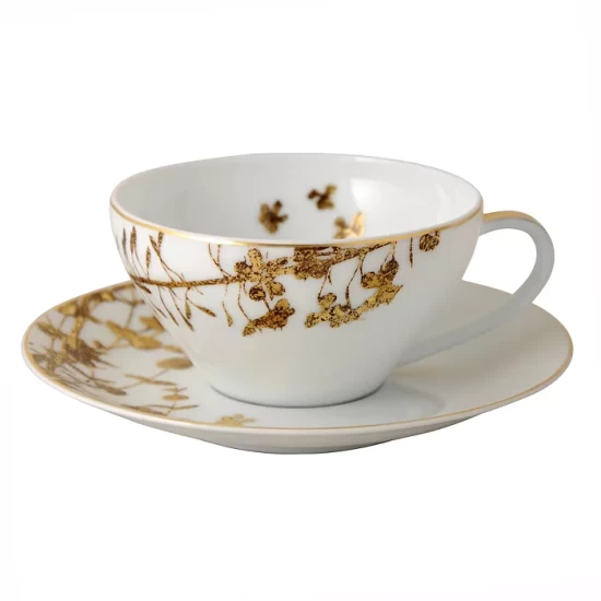 A coupe shape service decorated with golden leaves that seems to be brought to life by a subtle variation of nature in each piece. Vegetal Gold can stand alone or be accented with Diamond, Gold or Palmyre.