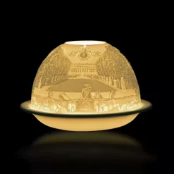Manufactured in the town of Limoges by the Bernardaud family, each votive is lovingly crafted of fine French porcelain. Using the Ancient Greek technique of Lithophany, a tealight candle placed beneath the dome beautifully illuminates a the great palace of Versailles.